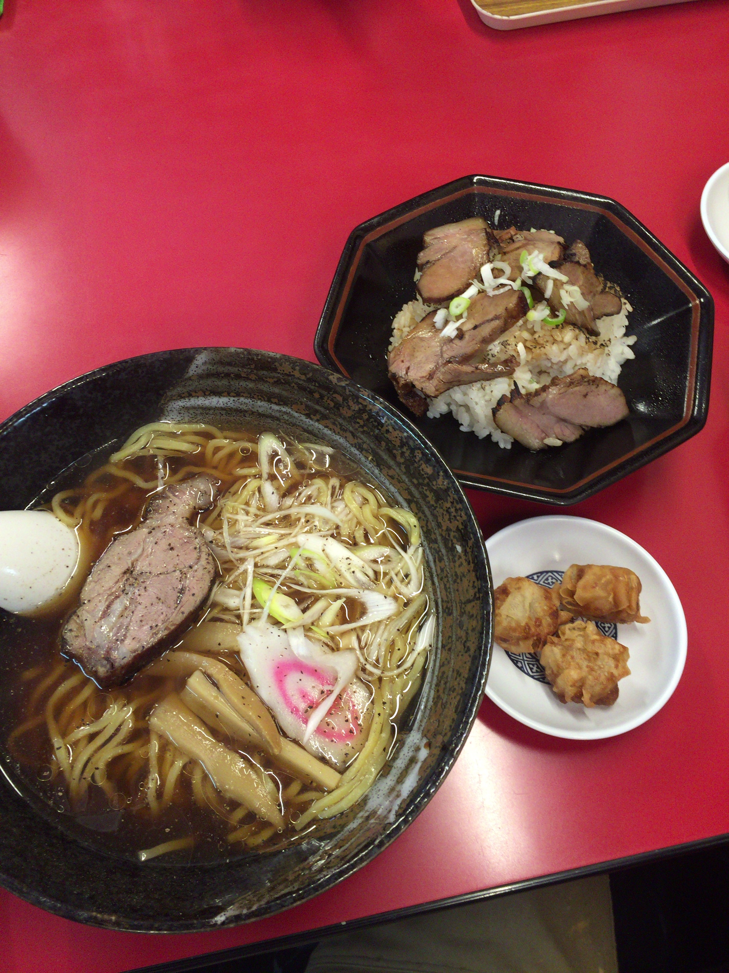 初なので、定番っぽいリュウトラセット!あたりさわりのない落ち着く感じの醤油ラーメンと炙りチャーシュー丼と揚シュウマイ!チャー丼はバーナー臭が強くてイマイチ。揚シューは特に感想ないうまさでした!!!ボリューム的には満足でした。今度は定食を食べてみます!!!